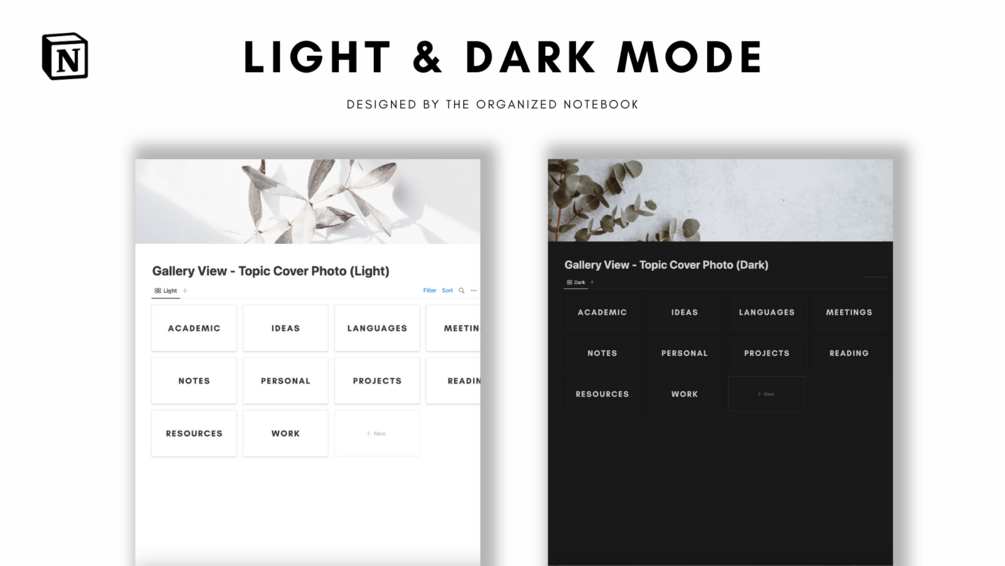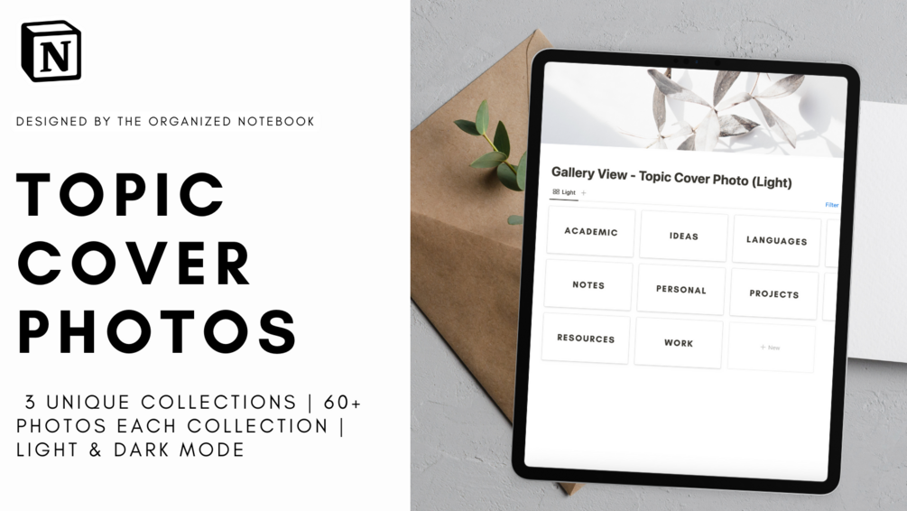 Notion topic cover photos are a great way to show your main topic of each page in an eye-catching way. These are designed for marking specific topics in gallery view and as the main cover photo of your Notion pages. Each photo collection comes in two colorways of light and dark, so you can use it in dark mode or light mode.