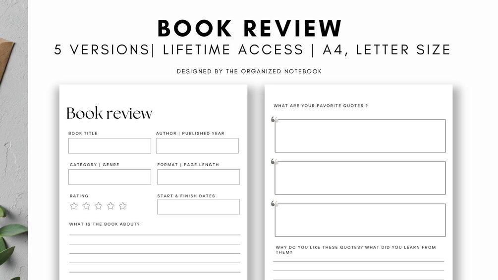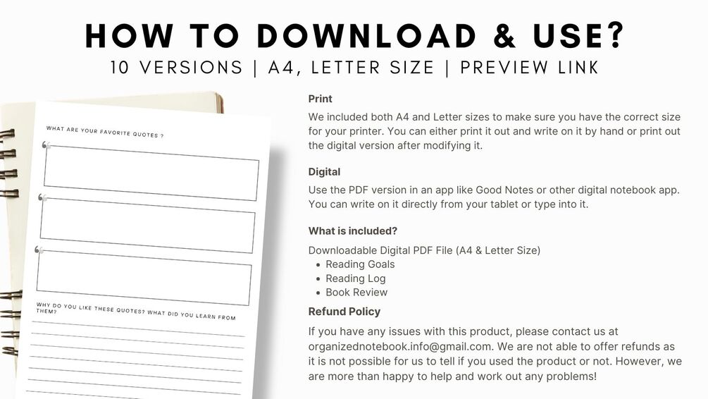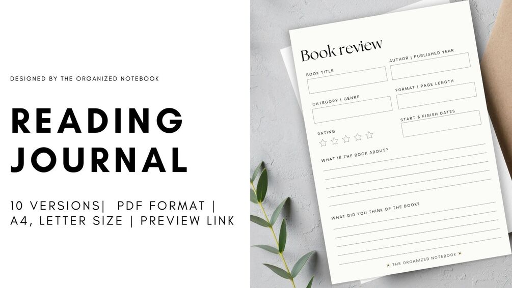 10 versions of PDF format reading journal templates in both A4 & Letter size are included in this Reading Journal.