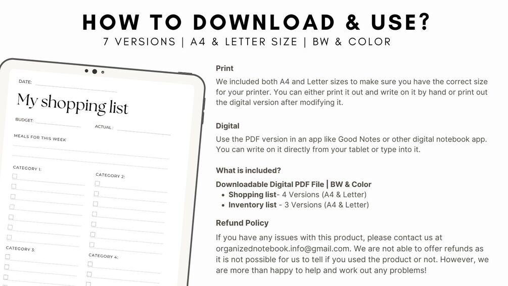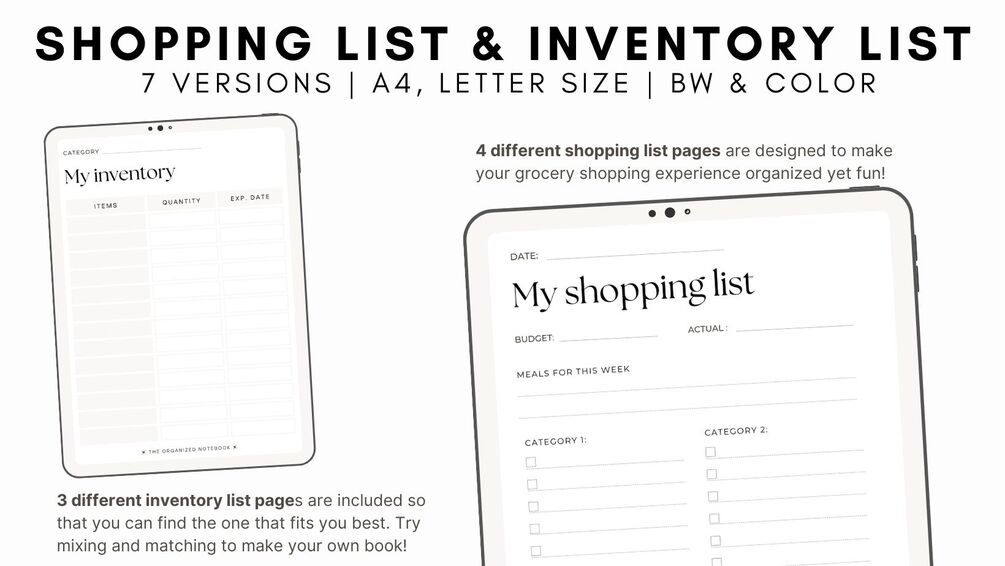Digital/Printable Shopping List & Inventory Tracker - 7 Versions | PDF | A4 & Letter size | BW & Color