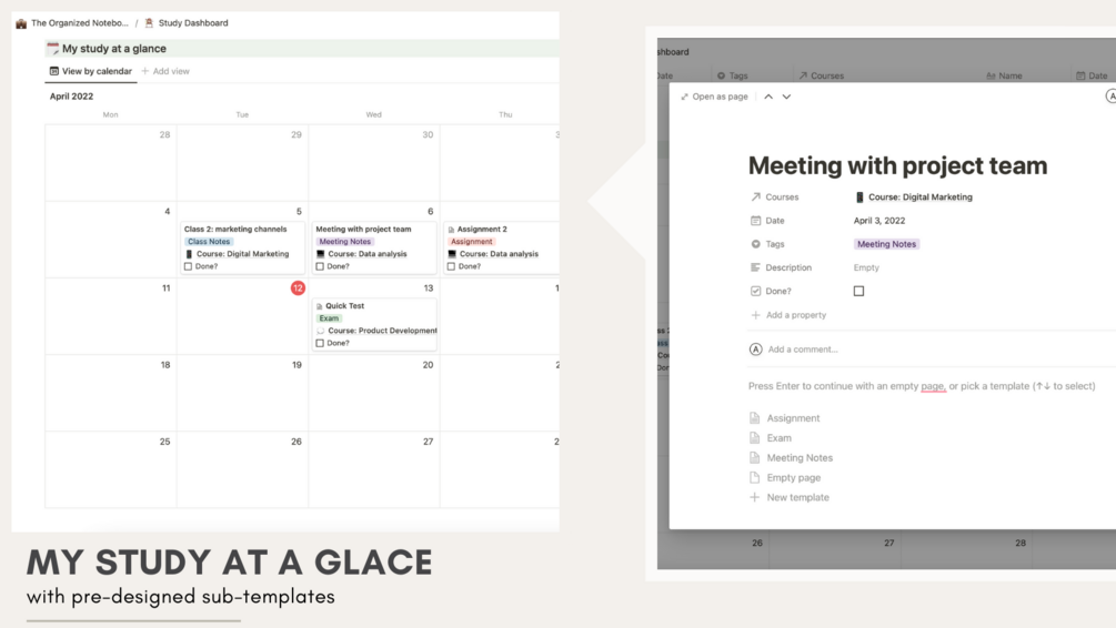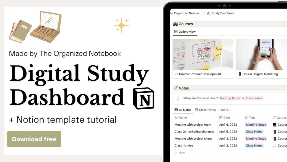 If you’re juggling many classes and need a way to organize all of your notes, assignments, and due dates, this is the template for you! This Study Dashboard Notion Template is simple enough so that it’s easy to use, but has enough features to cover all of your study needs. We also have an article on Top 10 Study Tips To Achieve Your Goals, if you want some extra study motivation!